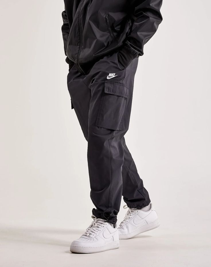Jet black cargo pants with multiple pockets and adjustable drawstrings